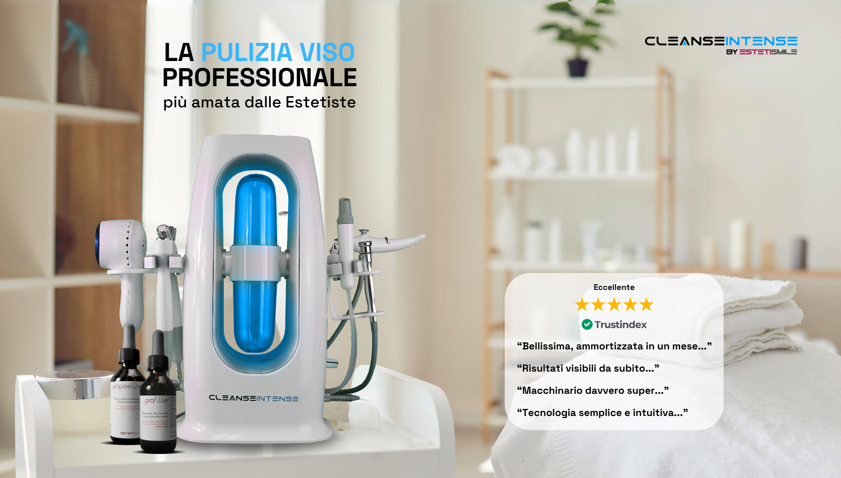 CleanseIntense è semplice da utilizzare, incorpora 6 tecnologie avanzate in 1 dispositivo, offre risultati straordinari e costa molto meno delle altre: per questo è la più amata dalle estetiste italiane